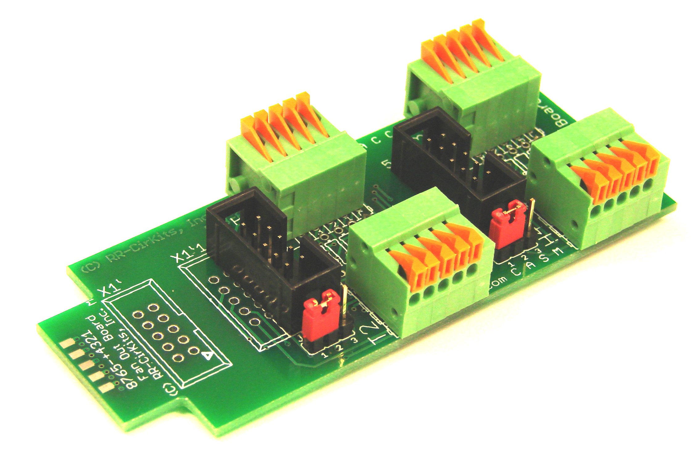 (Single Coil Solenoid Driver) This 8 line, optically isolated, single ended, high current, high voltage DC driver can drive up to 1A continous per line at up to 30VDC. When used with custom Tower LCC settings and a CD power supply this board will drive 4 dual-coil solenoid switch machines. (PTC fuse limited to 2-3A total per board for safety) Manual. |