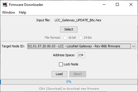 - From the file menu, select: 'LCC_LN_Gateway_RevD_UPDATE_B9c.hex'