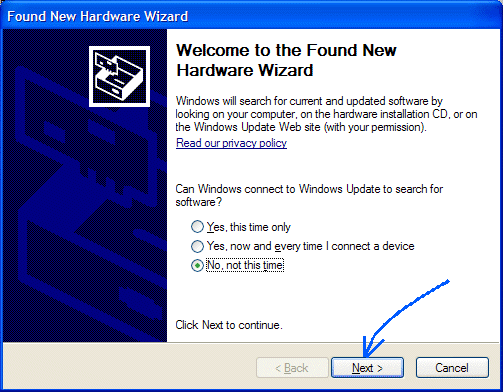 New Hardware Wizard" window opens up. Check the little circle that says "No,